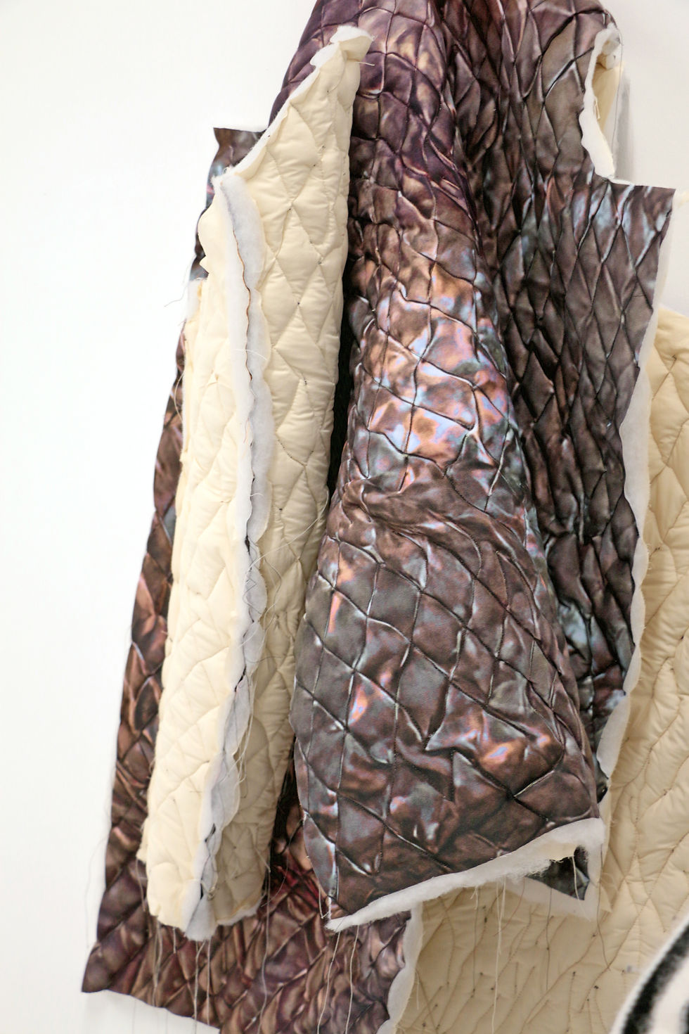 From beetles to water lilies, the inspiration and repetition of a motif introduce questions of vulnerability and “vulnerability in dispersion” (Seth Price, Dispersion, 2002). The jacket prototype—an envelope that could equally be a shell or a carapace—protects its wearer while also charging its appearance with meaning. It creates an intermediate space between interiority and exteriority. The experimental gallery space, with its interior, intimate, almost domestic character, echoes this intermediate position of surface and skin. If “repetition modulates an exit from oneself” (Deleuze on Monet’s Water Lilies), then the work in this series enacts a progressive, almost decomposed and protocol-driven unfolding in major stages. At once “domestic convenience” and “conceptual tool” (Sarat Maharaj), quilting here becomes a collaborative and deceptively mimetic visual and material playground.